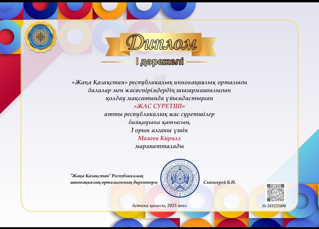 Макеев Кирилл мен Хадзиев Белилді «Жас суретші» республикалық байқауында I дәрежелі дипломмен марапатталуымен құттықтаймыз! Байқау «Жаңа Қазақстан» Республикалық инновациялық орталығының ұйымдастыруымен, балалар мен жасөспірімдер бастамаларын қолдау аясында өтті.